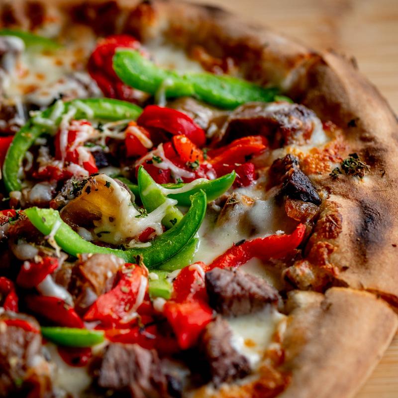 $25.00 | $22.00 | $19.00 | $16.00 • Grilled steak, Oven’s roasted red & green peppers, wood fired caramelized onions, garlic oil (no sauce).
