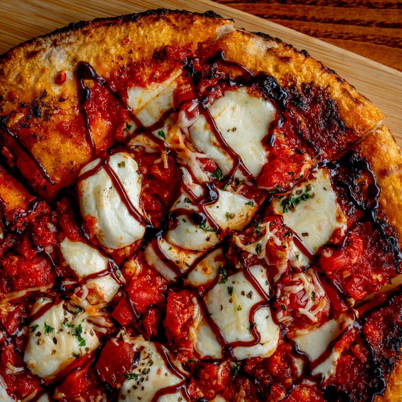 Sundried tomato pesto, diced tomatoes & fresh mozzarella finished with balsamic glaze.